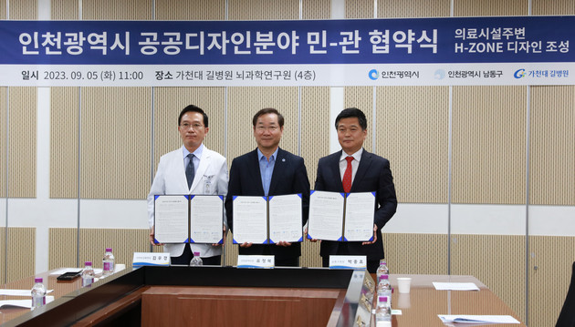 가천대 길병원(원장 김우경)은 5일 뇌과학연구원 회의실에서 인천광역시(시장 유정복), 인천 남동구청(청장 박종효)과 병원 주변 보행약자를 위한 공공디자인 업무협약식을 개최했다.