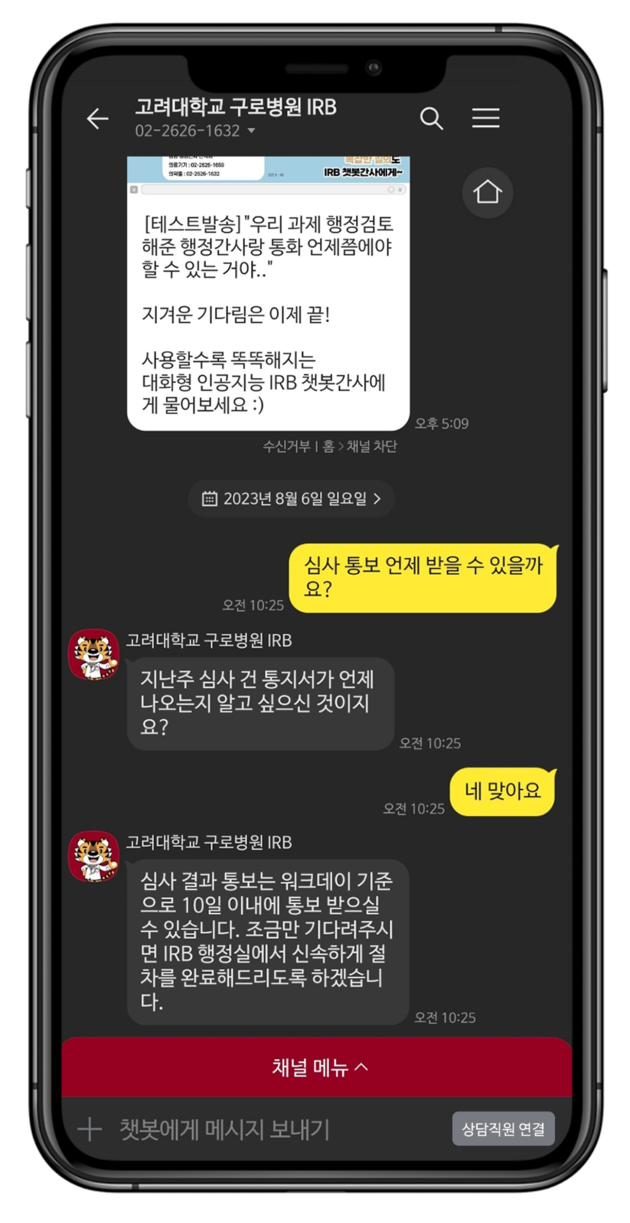 이번 AI 챗봇은 고대구로병원 연구대상자보호실이 임상연구심의 관련 문의 업무의 효율성 증대와 24시간 임상연구문의 환경구축을 통한 연구자 질의 편의성 확대를 위해 개발했다.