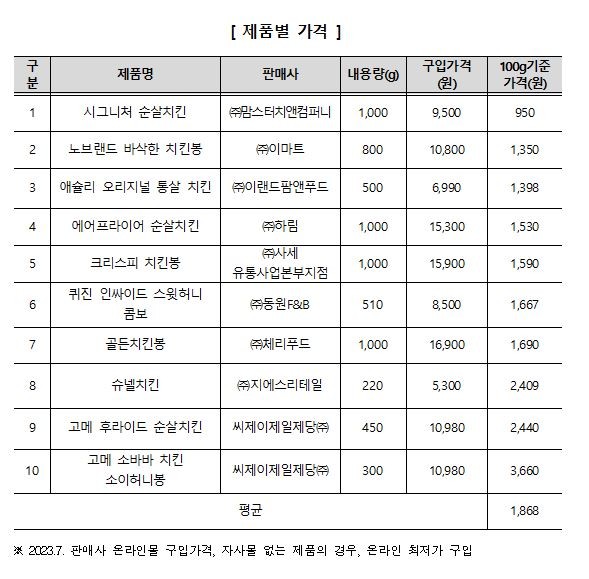 조사대상 냉동 치킨의 100g 기준 가격은 최소 950원부터 최대 3660원까지 제품 간 최대 3.8배 차이가 났다.