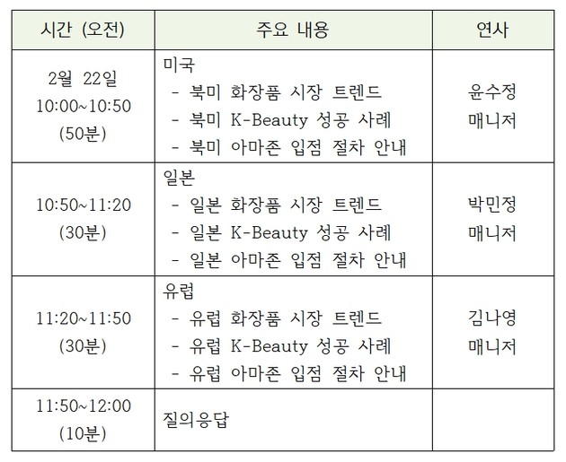 이번 웨비나는 미국, 일본, 유럽의 화장품 시장 트렌드와 K-Beauty 성공 사례, 아마존 입점 절차 안내에 대한 소개로 이뤄지며, 특히 미국 시장 진출에 대해 자세한 내용의 강의가 있을 예정이다.