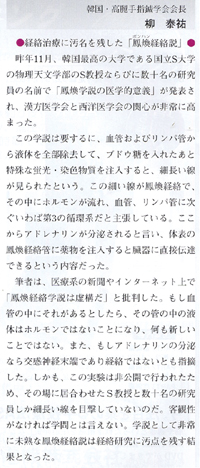 ‘의도의 일본’ 신년호는 “지난해 11월 S대학 물리천문학부 S교수 및 수십명의 연구원들이 ‘봉환학설의 의학적 의의’를 발표해 한방 및 의학계가 비상한 관심을 보였다. 요점은 혈관ㆍ임파관으로부터 액체를 전부 제거해 포도당을 넣은 후 특수한 형광ㆍ염색물질을 넣으면 미세한 선을 몇 명만이 볼 수 있다. 이것이 봉환경락이고 그 속으로 호르몬이 흐르는 제3순환계이고 이러한 계통으로부터 아드레날린이 분비된다고 말하면서 체표의 봉환경락관에 약물을 주입해 장기에 직접 전달할 수 있다는 내용이었다. 이것에 대해서 필자는 보건신문 등 인터넷 매체에 “이러한 봉환학설은 허구다”라고 지적했다. 만약 혈관 속에 있다면 새로운 것이 아니고, 그 관 속의 액체는 호르몬이 아니다. 객관성이 없으면 학문이 아니고, 아드레날린의 분비라면 교감신경말단이지 경락이 아니라고 지적했다. 분명하지 않은 봉환경락연구는 오히려 경락연구에 오점을 남겼다”라고 게재했다.
