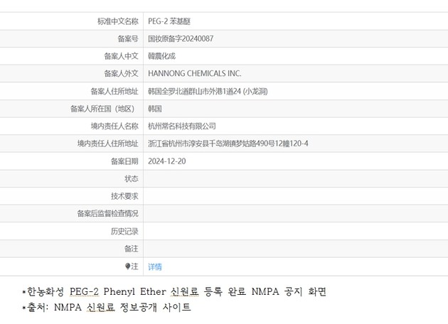 해당 원료는 용매 기능을 가진 저위험군 원료(유형2)로, 중국 국가의약품감독관리국(NMPA) 신원료 등록 목록에 포함됐다. 이를 통해 한농화성은 PEG-2 Phenyl Ether의 용매 역할을 기술적으로 입증하며, 안전성과 효능 데이터 자료와 등록 요건을 확보해 중국은 물론 글로벌 시장 진출의 발판을 마련했다.