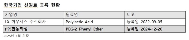 이번 신원료 등록 이전까지 국내 기업이 등록했던 원료는 단 2건이었으며, 그나마 1건은 자진 철회된 것으로 알려졌다.