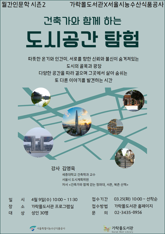 오는 4월 9일에는 서울시 도시계획위원이자 세종대 건축학과 교수인 김영욱 작가가 '건축가와 함께 하는 도시공간 탐험'을 주제로 강단에 선다. 김영욱 작가는 도시 공간에 대한 흥미로운 이야기를 통해 시민들의 지적 호기심을 자극할 예정이다.