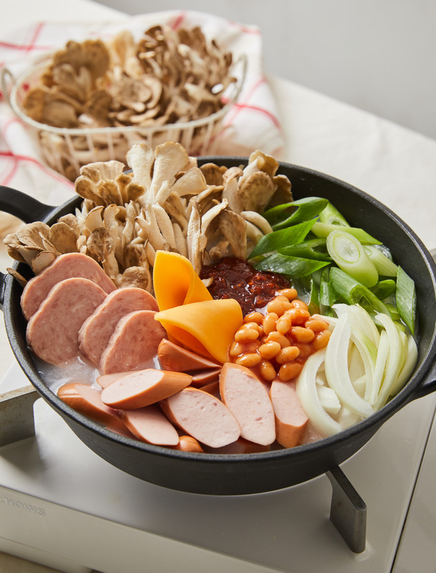 잎새버섯을 먹기 좋은 크기로 찢은 뒤, 대파, 양파, 통조림 햄, 양념장을 넣어 끓이면 매콤하면서 진한 '잎새버섯 부대찌개'가 완성된다.