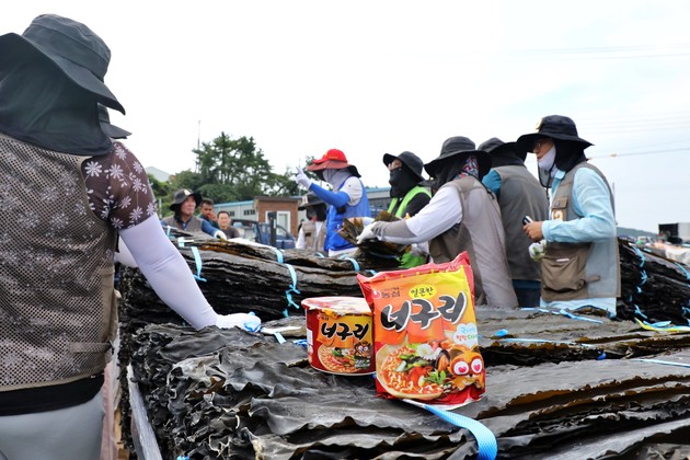 농심은 최근 전남 완도군 금일도에서 진행된 다시마 위판(경매)에 참여해 너구리 생산에 사용할 햇다시마 490톤을 구매했다고 밝혔다. 특히 올해는 현지 다시마 작황이 양호해 전년보다 구매량을 약 10% 늘려 완도 지역사회와 상생을 실천했다.