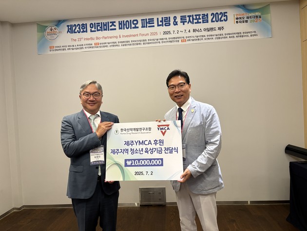 한국신약개발연구조합(이사장 김정진, 이하 신약조합)은 2025년 7월 2일 인터비즈 바이오 파트너링&투자포럼 개최 장소인 휘닉스 아일랜드 제주에서 신약조합 김정진 이사장, 제주YMCA 송규진 사무총장 및 인터비즈 조직위원회 관계자, 유관기관 관계자 등이 참석한 가운데 제주지역 청소년 육성기금 전달식을 가졌다.