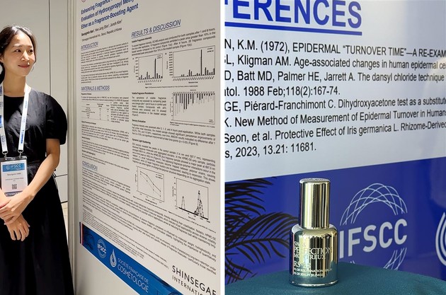 올해는 역대 최다인 6건의 포스터 발표를 통해 항노화의 주요 화두로 떠오른 엑소좀 기술 등에 대한 혁신 연구성과를 소개하며 전 세계 연구자들의 이목을 집중시켰다. 특히 신세계인터내셔날의 럭셔리 셀룰라 스킨케어 브랜드 '스위스퍼펙션' 팀과 함께 핵심 기술인 '아이리스 엑소좀'에 관한 브랜드 사이언스 연구성과를 발표해 화제를 모았다.