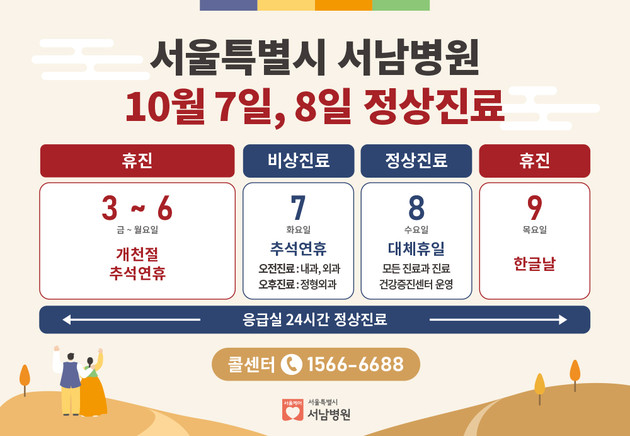 올해 추석 연휴는 추석(10월 6일)을 전후로 개천절(10월 3일)과 대체 공휴일(10월 8일), 한글날(10월 9일)이 겹쳐 장기간 휴일로 이어지는데 서울시 대표 공공병원인 서남병원은 응급 및 중증 환자의 진료 공백에 대한 대응을 위해 10월 7일(화) 내과/외과/정형외과 중심의 비상 진료와 8일(수) 외래 진료와 수술, 검사 등 모든 진료과를 정상 가동한다.