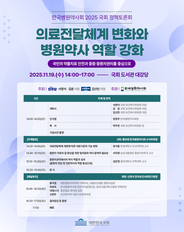한국병원약사회가 오는 11월 19일 국회 도서관에서 '2025 국회 정책토론회'를 열고, 의료전달체계 변화에 발맞춘 병원약사의 역할 강화, 특히 중증·중환자 관리에 전담약사 참여를 제도적으로 보장하기 위한 방안을 다각적으로 논의한다.