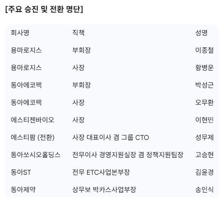 이번 인사에서는 이종철 용마로지스 대표이사 사장이 부회장으로, 성무제 에스티팜 대표이사 부사장이 대표이사 사장 겸 동아쏘시오그룹 R&D 최고책임자(CTO)로 전환되는 등 주요 계열사 전문성을 강화하는 데 초점을 맞췄다.