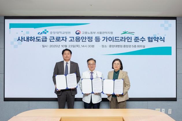 중앙대학교병원(병원장 권정택)은 고용노동부 서울관악지청, 제니엘과 함께 '사내하도급 근로자 고용안정 및 근로조건 보호 가이드라인 준수를 위한 상생협약'을 체결했다.