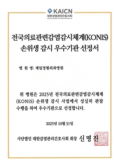 한편, 제일정형외과병원은 지난 9월 KONIS 수술 부위 감염(SSI) 부문 공로상을 수상하며, 감염관리 분야에서 높은 전문성과 지속적인 노력을 인정받은 바 있다.