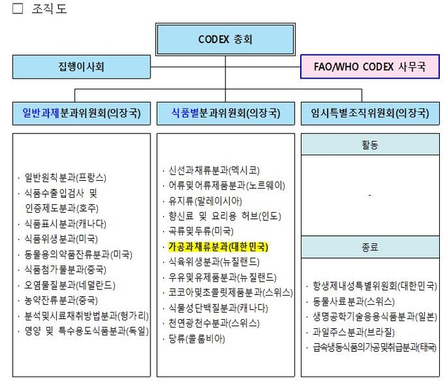 우리나라가 CODEX 가공과채류분과 의장국으로 선출되고 식약처가 의장으로 활동하게 됨에 따라 향후 김치, 인삼제품, 고추장 등 우리 식품의 세계규격 운영을 주도할 수 있게 됐다.