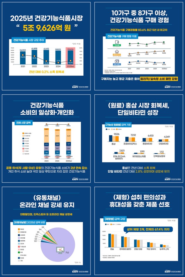 2025년 국내 건강기능식품 시장 규모가 5조 9626억원으로, 전년 대비 소폭 회복세(0.2%)를 보였다.
