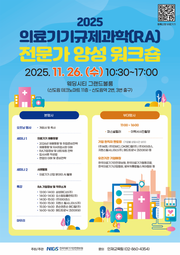 한국의료기기안전정보원(원장 이정림)은 오는 26일 서울 구로구 테크노마트 웨딩시티에서 '2025년 의료기기 규제과학(RA)전문가 양성 워크숍'을 개최한다고 밝혔다.