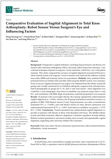 연구결과는 SCIE 국제저널인 <임상의학저널(Journal of Clinical Medicine)>에 'Comparative Evaluation of Sagittal Alignment in Total Knee Arthroplasty: Robot Sensor Versus Surgeon's Eye and Influencing Factors'라는 제목으로 2025년 11월호에 게재됐다.