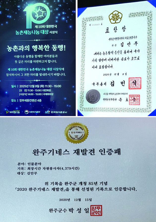 전북 완주군자원봉사센터 서금요법봉사단장 김안무 수지침사가 지난 12월 9일 국무총리 표창을 받았다.