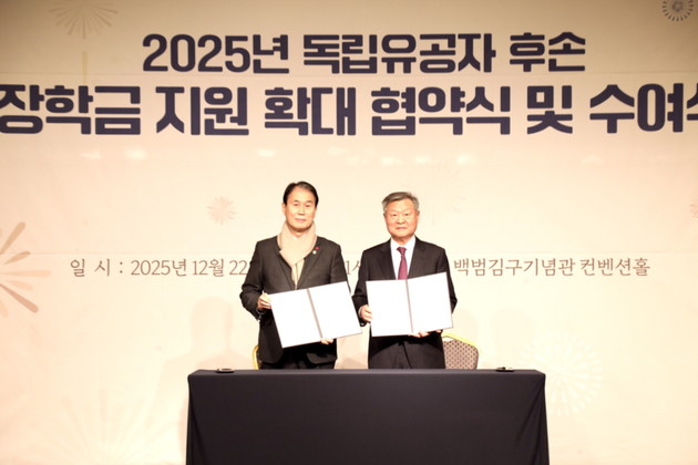 빙그레공익재단(이사장 정수용)은 국가보훈부(장관 권오을)와 함께 '2025년도 독립유공자 후손 장학금 지원 확대 협약식 및 수여식'을 22일 서울 용산구에 위치한 백범김구기념관에서 개최하고, 장학생들에게 장학금을 전달했다고 밝혔다.