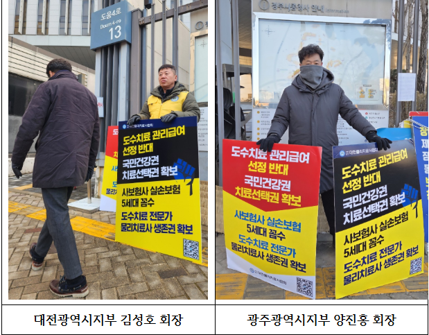 1인 시위에 참가한 협회 대전광역시지부 김성호 회장은 "이번 시위의 본질은 물리치료사의 수익 보전이 아닌 국민에게 질 높은 의료 서비스를 제공할 수 있는 환경을 지키는 것"이라며 "도수치료는 단순한 마사지가 아니라 해부학적 지식을 바탕으로 한 전문적인 의료 행위며 이를 제도적으로 억제하는 것은 국민이 더 나은 의료 서비스를 선택할 권리를 박탈하는 것과 같다"고 비판했다.