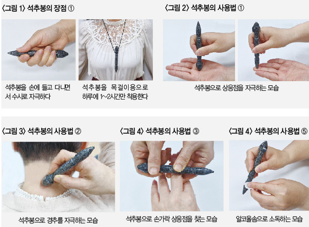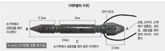 상응점, 과민점, 요혈점을 찾은 다음에는 석추봉으로 다시 압박이나 마사지 자극을 줄 수 있다.