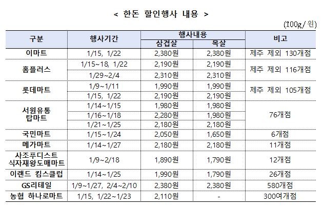 돼지고기는 한돈자조금을 활용해 대표 부위인 삼겹살, 목살에 대해 1월 8일(목)부터 전국 9개 대형마트, 슈퍼마켓 1천여개 지점 및 농축협 하나로마트에서 최대 30%까지 할인을 실시한다.