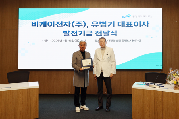 중앙대학교의료원(의료원장 이철희)이 비케이전자 유병기 대표이사로부터 지역의료서비스 발전과 미래의학 선도를 위한 발전기금 1억원을 전달받았다고 밝혔다. 전달식은 지난 16일 중앙대학교광명병원 5층 윤필노회의실에서 개최됐다.