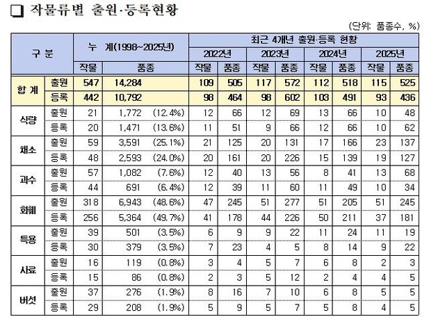 2025년 한 해 동안 출원은 115작물 525품종, 보호등록은 93작물 436품종이다. 출원 비중은 화훼류가 245품종(47%)으로 가장 많았고, 채소류 137품종(26%), 과수류 68품종(13%), 식량작물 48품종(9%)이며, 출원이 가장 많았던 작물은 장미(58품종), 국화(39), 고추(24), 배추(22), 복숭아(17), 벼(17) 순이다.