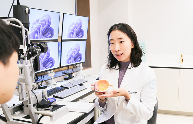 세란병원 안과센터 김주연 센터장은 "고도근시 눈은 럭비공처럼 뒤쪽이 늘어난 형태가 된다. 이때 망막층이 얇아지고 미세 손상이 누적되면 황반 주변에 변성 병변이 발생한다"며 "초기에는 증상이 미미할 수 있지만 황반변성이 진행되면 중심 시야 흐림, 변형시, 미세한 시력 감소 등이 나타날 수 있다"고 설명했다.
