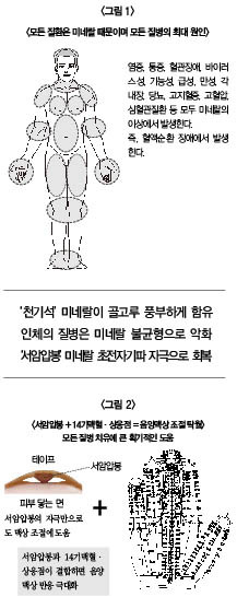 주어서(음양맥상을 조절시켜) 질병을 낫게 하지만 각종 병 원인인 염증, 통증, 혈관성(혈관 수축이나 막힘), 신경성, 암성, 자가면역질환, 바이러스성, 기능상, 기관 이상으로 인한 급·만성 고질적인 질환이 나타나고 있지만 위의 방법들만으로는 이들 병인을 해소하는 데는 한계성이 있다. <그림 1>