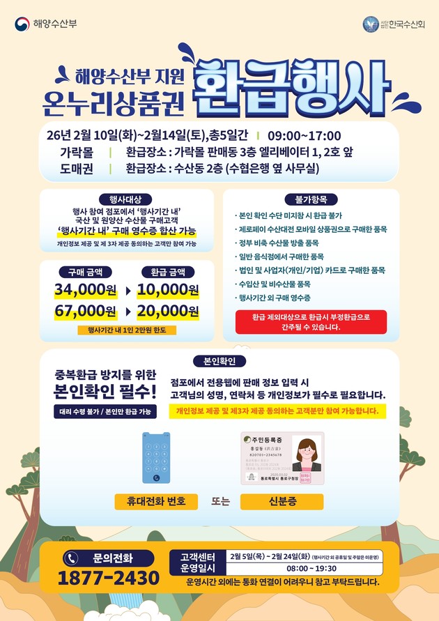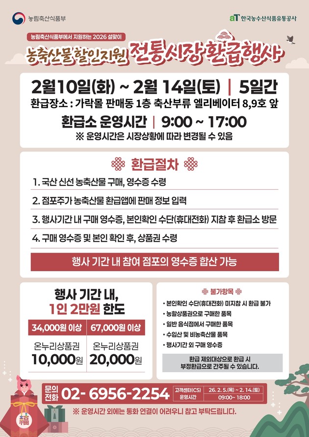 서울시농수산식품공사(사장 문영표, 이하 '공사')가 관리하는 국내 최대 공영도매시장인 '가락시장'과 복합쇼핑몰 '가락몰'에서는 2026년도 설 명절을 앞두고 농축수산물을 구매하는 고객을 대상으로 2월 10일부터 2월 14일까지 5일간 온누리상품권 환급행사를 진행한다.