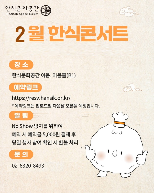 농림축산식품부와 한식진흥원이 주최·주관하는 '2월 한식콘서트'가 오는 2월 27일(금) 오후 2시, 서울시 종로구에 위치한 한식문화공간 이음에서 개최한다.