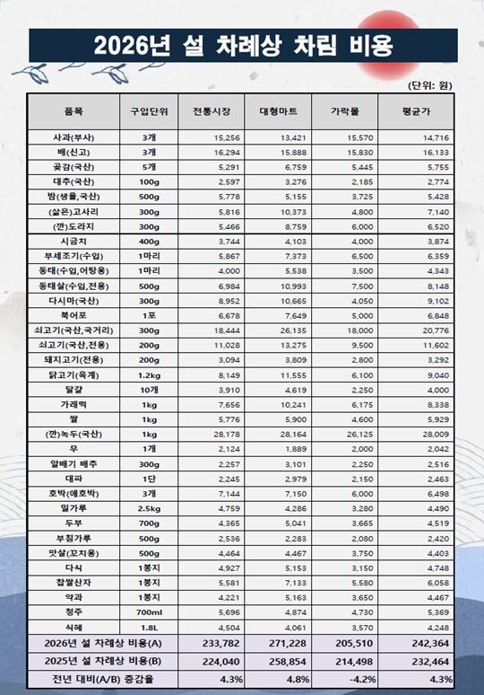 서울시농수산식품공사(사장 문영표, 이하 공사)는 설 명절 장보기에 도움이 되는 정보를 시민에게 제공하고, 설 성수기 가격 안정을 위한 정보 제공 차원에서 서울시 내 대형마트, 전통시장, 가락시장(가락몰) 등 총 25개소를 대상으로 실시한 '설 차례상 차림 비용(이하 구매비용)' 조사 결과를 발표했다.