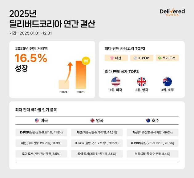 딜리버드코리아의 연간 거래 데이터 역시 이 같은 흐름을 반영해 K-패션·K-POP을 비롯한 라이프스타일 전반에서 고른 성장세를 보였다. 딜리버드코리아가 2025년 연간 역직구 데이터를 분석한 결과, 카테고리별 매출 1위는 패션(의류·신발·보석·가방)으로 전체의 36.7%를 차지했으며, K-POP(음반·굿즈·포토카드)은 34.5%로 2위에 올랐다.