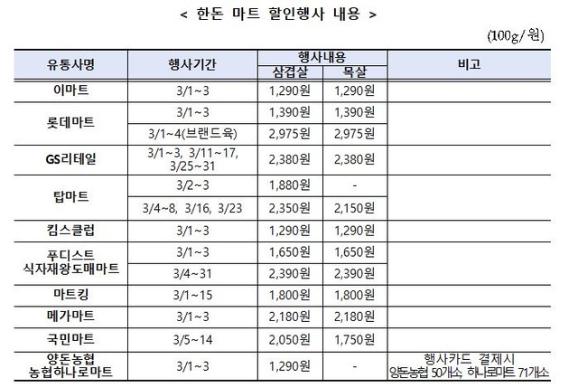 한돈자조금을 활용해 대표 부위인 삼겹살, 목살에 대해 3월 1일부터 전국 9개 대형마트, 1천여개 지점 및 농협 하나로마트와 온라인몰 등에서 최대 50% 수준의 할인 판매를 실시한다.