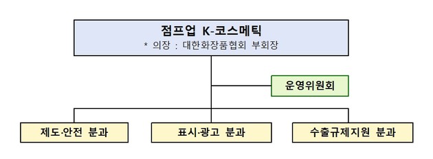 점프업 K-코스메틱 협의체는 화장품 분야 정책 수립과 규제개선을 위한 상설 민관 소통 창구로 지난 2022년 6월 출범했다. 운영위원회와 3개 분과(제도·안전/표시·광고/수출규제지원)로 운영되고 있다.