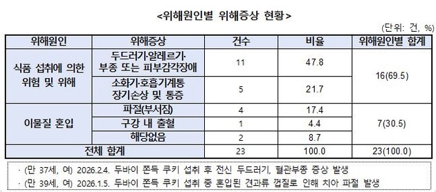 올해 1월부터 2월까지 소비자위해감시시스템(CISS)에 접수된 두바이 쫀득 쿠키 관련 위해정보는 총 23건이었다. 이 중 16건은 '식품 섭취에 의한 위험 및 위해', 7건은 '이물질 혼입'이 위해 발생 원인으로 나타났다.