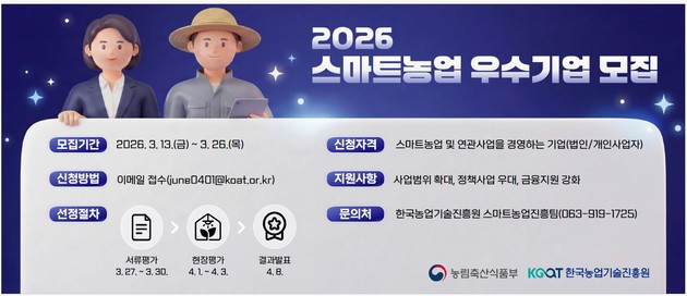 신청 기간은 3월 13일부터 26일 18시까지이며 이메일을 통해 신청할 수 있다. 신청 자격, 제출 서류, 평가 절차 등 자세한 내용은 농식품부(mafra.go.kr)와 농진원(koat.or.kr) 누리집에 게시된 공고문에서 확인할 수 있다.
