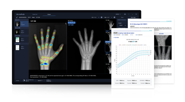 플랫폼에 내재화된 솔루션 마이본에이지(mai:Bone Age)도 주목받고 있다. 수골 X-ray 영상을 분석해 골연령 판독을 보조하는 AI 솔루션으로, GP(Greulich-Pyle) 방식 모델을 기반으로 최대 3순위 예상 골연령을 제안한다. Heat Map을 통해 판독 부위를 직관적으로 제공하며, AI 분석 결과와 함께 의료진이 추가 소견을 입력할 수 있다.