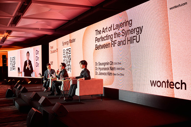 첫 번째 세션에는 'RF·에너지 기반 장비를 활용한 복합 치료 전략'을 주제로 김재우 원장(클래스원의원), 남현석 원장(오운의원), 오승민 원장(오앤의원)이 참여했다. 세 원장은 원텍의 올리지오(Oligio)시리즈를 중심으로 최신 미용 치료 트렌드와 임상 활용 사례, 향후 치료 방향을 심도 있게 논의하며 참석자들의 큰 호응을 이끌어냈다.