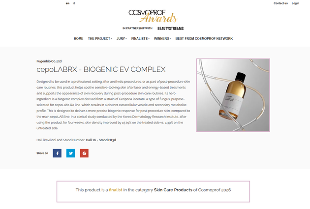 퓨젠바이오(대표 김윤수)는 자사의 바이오 더마 스킨케어 브랜드 세포랩RX의 '바이오제닉 EV 콤플렉스'가 2026 코스모프로프 어워즈에서 스킨케어 부문 파이널리스트에 선정됐다고 27일 밝혔다.