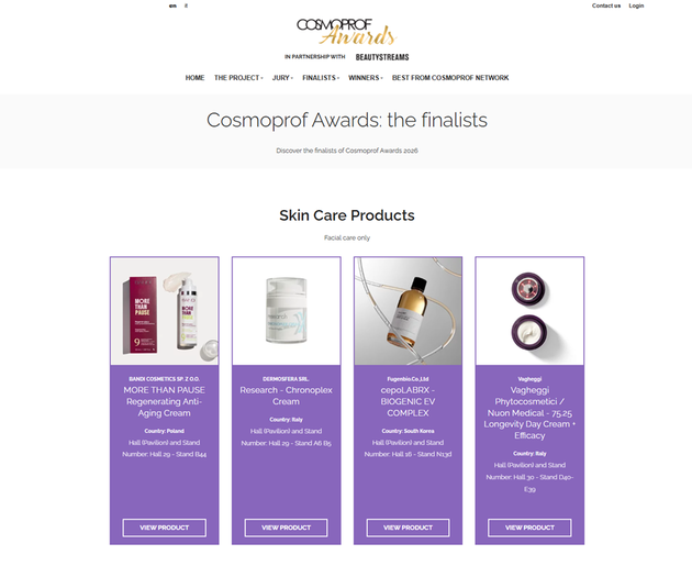 세포랩RX는 이달 26∼28일(현지시각) 이탈리아 볼로냐 피에레 전시장에서 개최 중인 '코스모프로프 월드와이드 볼로냐'에 참가, 아시아 지역 뷰티 브랜드 중 유일하게 코스모프로프 어워즈 스킨케어 부문 최종 후보에 올랐다.