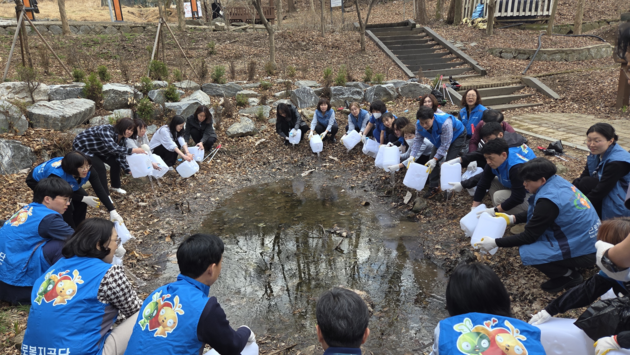ESG 경영의 환경 분야 실천으로 가뭄에 말라버린 도룡뇽 산란지 급수와 산책로 청소를 진행했다. 도룡뇽은 생태계 건강 지표종으로 서식지 개선이 시급한 상황이다.