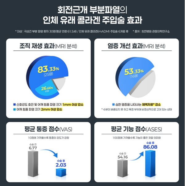 이러한 가운데, 최근 힘찬병원 관절의학연구소는 회전근개 부분 파열 환자를 대상으로 시행한 '힘줄 내 인체 유래 콜라겐 주입술'의 임상 및 구조적 효과를 분석한 연구결과를 발표했다. 이번 연구는 통증 완화와 기능 개선을 넘어, MRI를 통해 힘줄의 구조적 변화까지 평가했다는 점에서 주목된다.