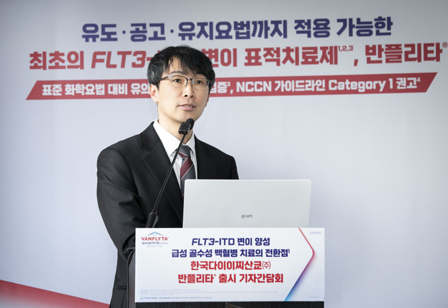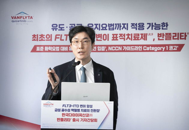 한국다이이찌산쿄는 14일 서울 더 플라자 호텔에서 기자간담회를 열고, 반플리타의 임상적 가치와 FLT3-ITD 변이 양성 AML 치료 전략을 공유했다. 반플리타는 지난 1월 식품의약품안전처로부터 새로 진단된 FLT3-ITD 변이 양성 AML 성인 환자의 표준 화학요법과의 병용 및 단독 유지요법으로 품목 허가를 받은 바 있다.