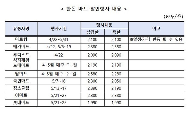 한돈자조금을 활용해 대표 부위인 삼겹살, 목살에 대해 4월 22일(수)부터 전국 8개 대형마트와 온라인몰에서 최대 50%까지 할인을 실시한다.
