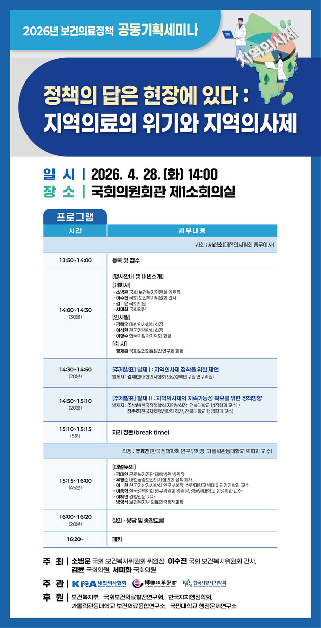 대한의사협회(회장 김택우)는 오는 4월 28일 오후 2시 국회의원회관 제1소회의실에서 국회 보건복지위원회 소병훈 위원장, 이수진 간사, 김윤 의원, 서미화 의원과 뜻을 모아 '2026년 보건의료정책 공동기획세미나'를 개최한다.