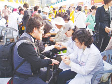 이날 행사에는 서울시 16개구의 봉사단이 참여해 장애인 활동에 도움을 주는 다양한 프로그램을 진행했다. 서금요법 봉사단원들은 관악구 자원봉사센터와 연계해 서금요법(서암침봉·서암봉·서암뜸) 등을 장애우들에게 시술해줬다. 그 중 서금요법이 인기가 가장 많아 ‘KBS-2 무한도전 큐’와 ‘장애인 인터넷 방송국’에서 취재 경쟁이 벌어졌다고 한다. 나순옥 지회장은 “장애우들에게 서금요법 시술을 해 줬더니 모두가 기뻐했다”며 “적극적으로 봉사활동에 참여해 준 단원들에게 감사드린다”고 말했다. |