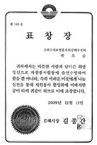 최근 김해시 자원봉사자의 밤 한마음대회에서 김해지회(지회장ㆍ박수지 055-337-6547) 소속 박옥순 회원이 ‘김해시장 표창장’, 성순옥(김해 수지회 부회장) 회원이 2회째 ‘김해시 종합사회복지관장상’을 받았다. 수상자들은 그동안 주민들에게 서금요법 봉사활동을 성실히 수행한 공로를 인정받아 상을 받은 것이다. 또 최근 ‘김해시보’에 ‘어른신들에게 건강선물한다’라는 제목으로 서금요법 봉사활동이 크게 보도됐다. 박수지 지회장은 “올해는 많은 회원들이 입회할 것 같다. 금경술 학술로 더욱 다양한 봉사를 전개할 것이다”라고 소감을 밝혔다. |