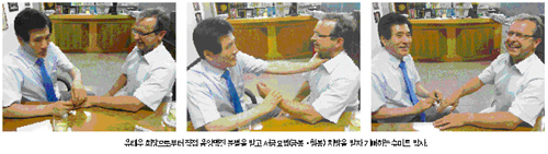 1년 만에 한국을 방문한 슈미트 박사는 “독일에서 1000명 이상의 의사들에게 서금요법(고려수지침)을 알렸고, 고려수지침으로 환자들을 자극, 좋은 효과를 보고 있다”면서 “서금요법 좋다. 독일과 유럽에서 고려수지침이 널리 알려지고 있다. 21세기 최고의 의술이다”고 말했다. 서울에서 열린 의료세미나에 참석한 뒤 학회를 방문한 슈미트 박사는 바쁜 일정을 소화하느라 조금 피곤한 모습이었다. 유태우 회장으로부터 직접 음양맥진 분별을 받고 서금요법(금봉ㆍ침봉) 치방을 받자 얼굴이 환해지면서 “몸이 편안해지고 피곤함이 없어졌다”고 기뻐했다. |